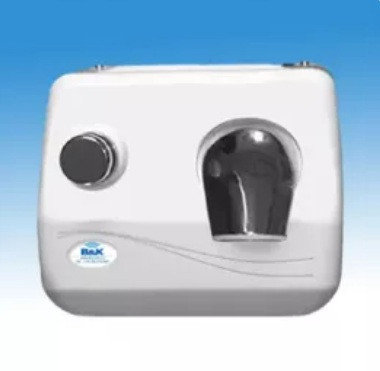 Uszodai hajszárító, falra szerelhető, nyomógombos indítással, fehér porszórt fém burkolattal, időszakosan nagy forgalmú öltözőkbe, strandokra, uszodákba ajánlott.