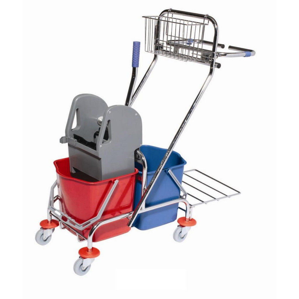 Krómozott kétvödrös takarítókocsi.